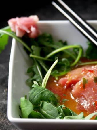 J’ai mis beaucoup de temps à m’intéresser à ce livre, et pourtant c’est une mine, à chaque fois que j’y pioche une recette c’est un succés. La première testée a été ce sashimi de thon. Elle me plaisait car elle ne nécessitait pas de cuisson, parce qu’entre nous la cuisine de Bocuse ne m’attire pas plus que cela, surtout depuis que j’ai vu un « fameux » reportage censé nous parler de la cuisine de cet emblême de la gastronomie française, et où finalement il n’était question que des frasques du monsieur et de sa vie sentimentale tiraillée entre sa femme et ses 2 maîtresses (quelle santé ce Paulot !).